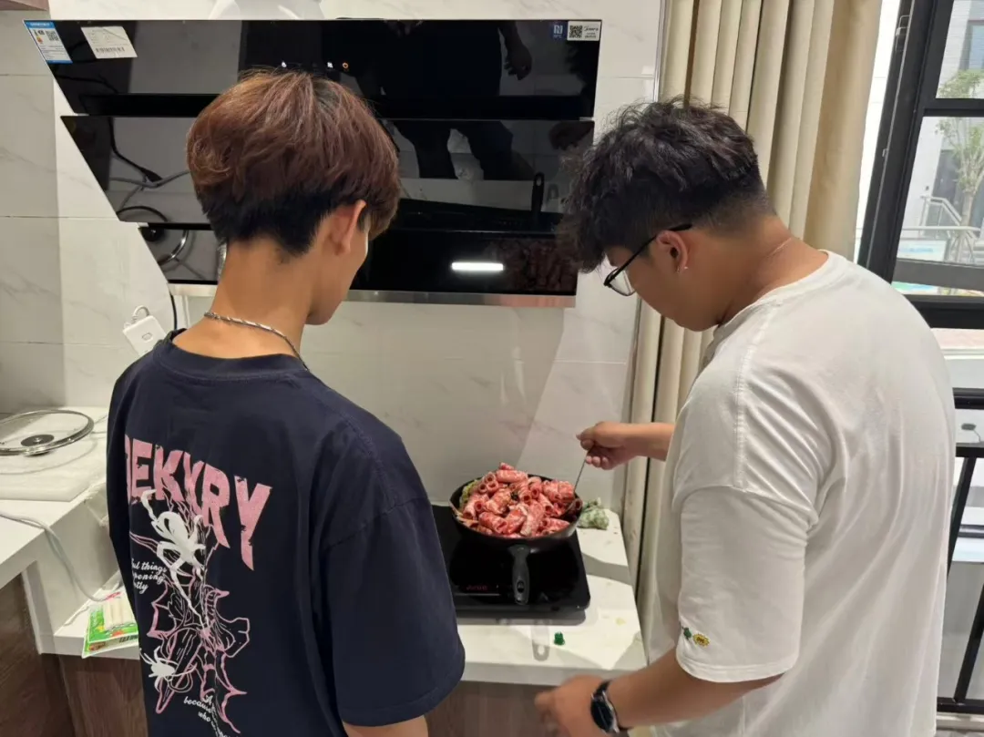 活动现场,同学们以小组为单位分工协作。徐育民、符金龙等同学化身“大厨”,凭借烹饪热情与技能,引领小组高效推进美食制作。从切配食材时对中韩刀法差异的探索,到调味环节对韩国美食精致调味与中餐包容风格的对比交流,大家在实践中深入挖掘饮食文化内涵。制作韩式泡菜汤,探讨泡菜在韩国饮食中的“灵魂”地位;煎制韩式烤肉,剖析中韩调味、吃法与饮食习俗的不同,文化理解在烹饪过程中不断深化。