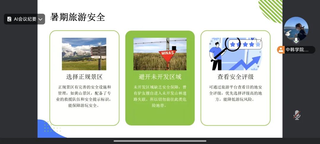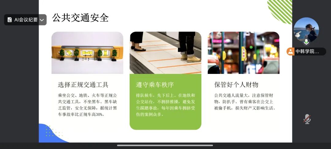 此次主题班会中韩学院以开展线上会议的活动,落实"立德树人"根本任务的具体实践,体现了学院对学生安全的高度重视。通过系统化的安全教育,有效提升了学生的风险防范意识和应急处置能力,为构建平安校园、保障学生健康成长奠定了坚实基础。