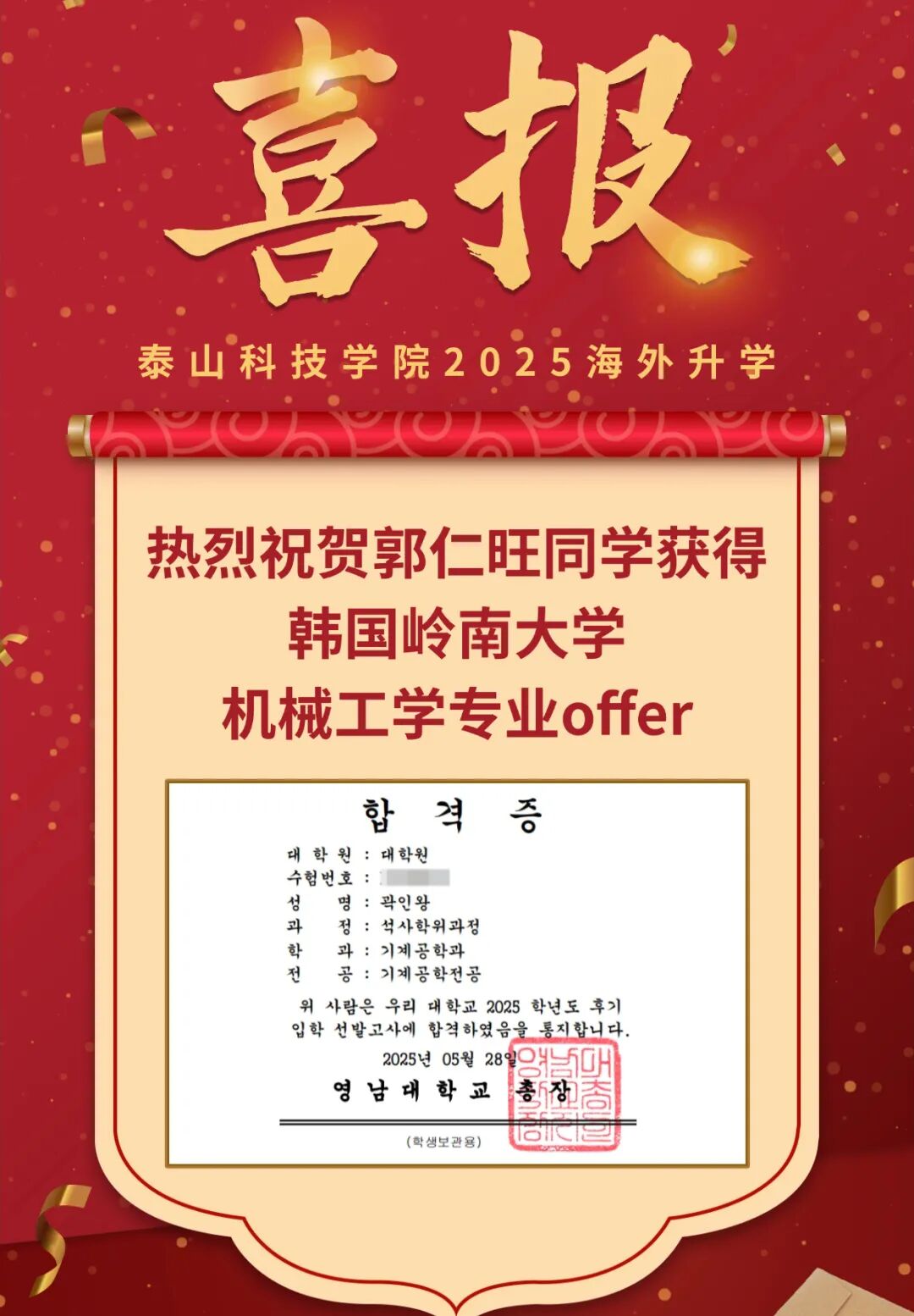 郭仁旺,2003年生,山东潍坊人,2021级机械电子工程(本科)专业学生。凭借清晰的规划和不懈的努力,成功获得韩国岭南大学的录取通知书,即将踏上研究生学习生涯。这段旅程告诉他:清晰的规划、不懈的坚持,足以跨越起点,叩响世界学术舞台的大门。