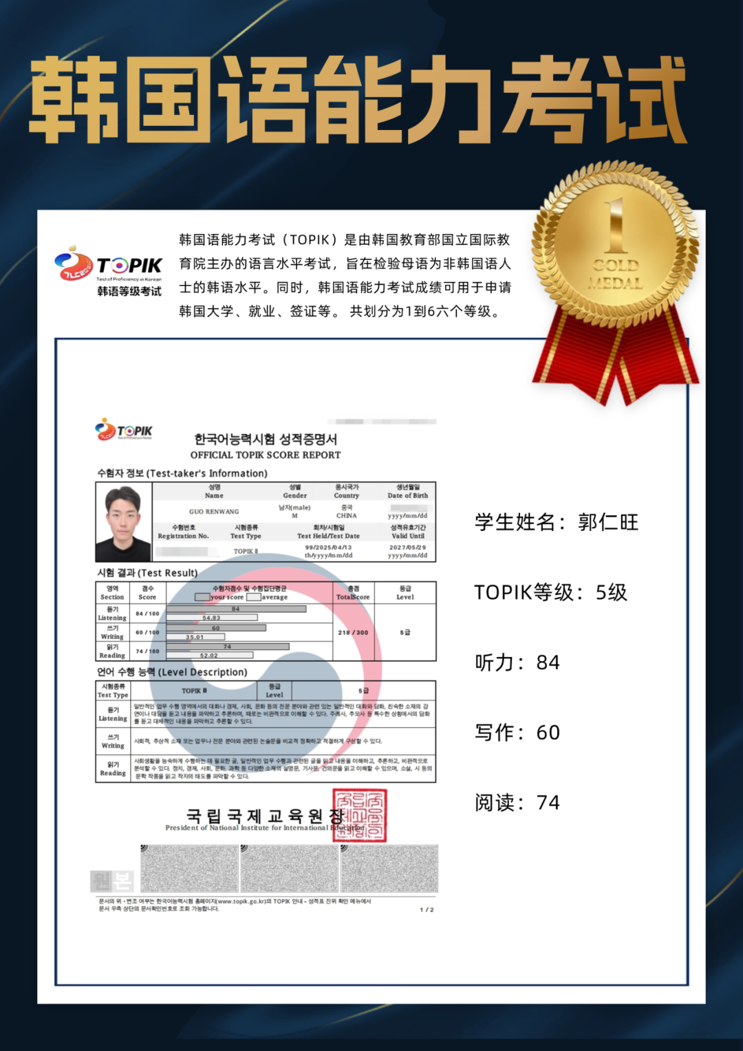 一封来自韩国的邮件点亮了我的电脑屏幕——我被韩国岭南大学正式录取了!那一刻,复杂的情感涌上心头:是夙愿达成的激动,是努力终获认可的释然,更是对未来无限可能的憧憬。时间回到2023年秋,怀揣着对未来的期待和近乎为零的韩语基础,我走进了中韩学院,成为了逯叶老师班级的一员。谁能想到,就在这里,我实现了从“韩语小白”到最终考取TOPIK 5级的惊人蜕变。我深知,“语言是命门!”没有它,留学就是空谈。这份成绩单背后,是近乎苛刻的自律和无数个日夜的汗水。我的日程表近乎“铁律”:清晨雷打不动背单词、学语法;白天学习在逯叶老师的课堂上全神贯注,抓住每一个练习机会;晚上是大量的阅读和听力“轰炸”;周末则集中火力“刷”真题,死磕错题。尤其是写作这块硬骨头,挑战巨大。既要保证本专业(机械电子工程)繁重专业课的学习质量,又要从零攻克一门全新的语言,时间管理成了最大的考验。高级语法和精准表达更是难上加难,我便开始了“榨干每一分钟碎片时间听韩语广播,逼自己不停地写、反复地改,厚着脸皮主动找逯叶老师和其他老师批改纠错”那段日子很累,但无比充实。